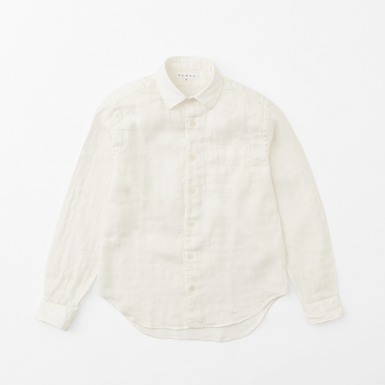 おもて面を吸湿速乾性に優れ、ナチュラルなスラブ感&光沢を持つリネンガーゼにして 直接肌に触れるうら面は、吸湿性と共に柔らかな肌触りに優れたコットンガーゼにした 「Wフェース」のガーゼ素材を使用したセミワイドカラーシャツ。