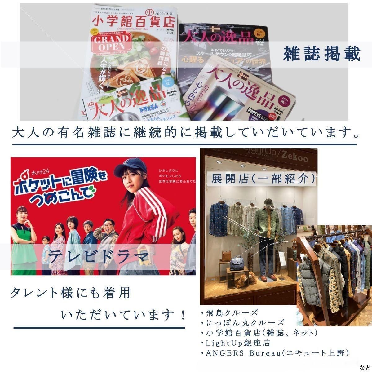 縫製: 本縫い巻き伏せ、高運針(3cm/21針)、柄合わせ仕様